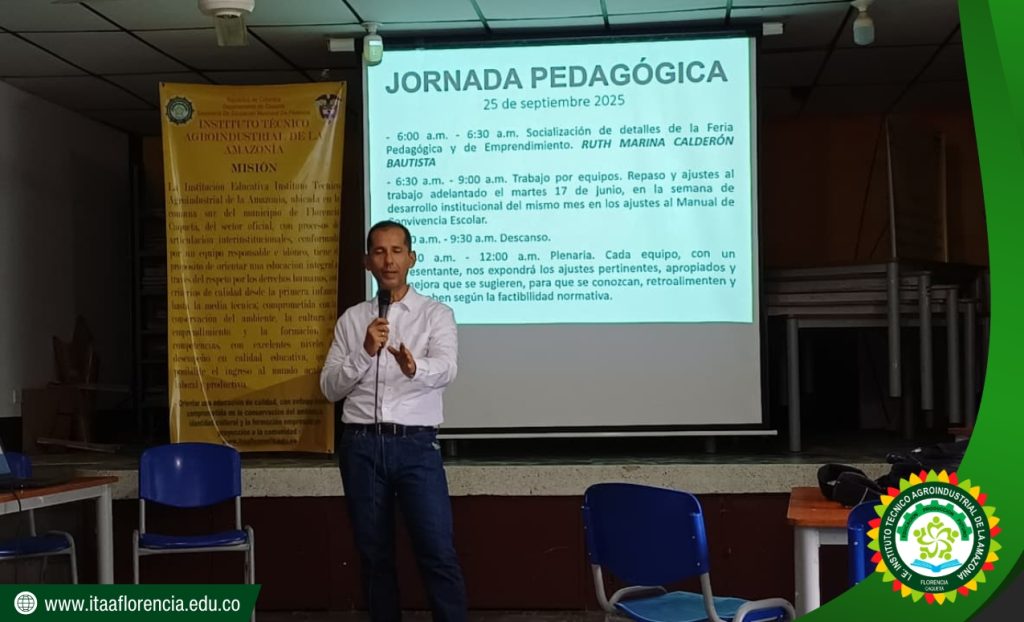 El pasado 25 de septiembre de 2025, el Instituto Técnico Agroindustrial de la Amazonia llevó a cabo una importante Jornada Pedagógica en el Aula Máxima de la sede Bella Vista, en cumplimiento de la Circular N.° 042, proferida por el señor Rector César Augusto Cabrera Muñoz.